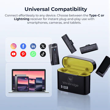Connect effortlessly to any device. Choose between the Type-C or Lightning receiver for instant plug-and-play use with smartphones, cameras, and tablets.