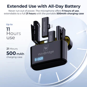 Never run out of power. The microphone offers 11 hours of use, extendable to a full 21 hours with the portable 500mAh charging case.